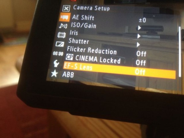 This is an interesting addition to the menu system. As I’ve reported before using an EF-S lens like the 17-55 that I use regularly can result in vignetting or light fall off in the corners. This happens because the sensor in the C300 & C100 is slightly wider than the sensor in a 7D or similar DSLR so the EF-S lenses don’t quite cover the sensor evenly. The EF-S Lens option in the C100’s menu uses a smaller area within the sensor and then scales the resulting image up to 1080p in camera, so removing the corners that are problematic.