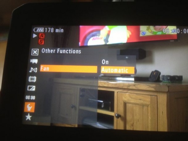 On switching on the C100 for the first time I was surprised by how loud the fan was. It was actually louder than the fan on my C300 and blows air out of the vent on the side of the camera with so much force that you can feel the air moving from a few inches away from the camera! One nice addition in the menu is an option to have the have automatically switch off when it’s not needed, enabling this option immediately silenced the camera. I won’t know until I’ve used the camera more how much it needs to use the fan in normal shooting conditions.